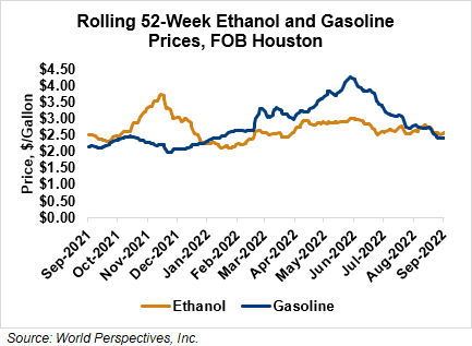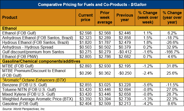 FOB Houston ethanol prices finished last week 2.4 percent lower but are up 2.7 percent through Tuesday’s trading from Friday’s close. FOB Houston ethanol prices are quoted at 68.62 cents/liter (259.76 cents/gallon). FOB Santos, Brazil anhydrous ethanol prices were higher last week; they are up in early week trading, rising 1.5 percent to 61.37 cents/liter (232.295 cents/gallon) through Tuesday’s trading.