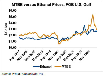 MTBE prices fell 6.1 percent last week and continued that trend in early week trading, falling 1.3 percent from Friday’s close through Tuesday’s trading. MTBE’s premium to FOB Houston ethanol has decreased from last week’s report and stands at 7.78 cents/liter (29.44 cents/gallon).