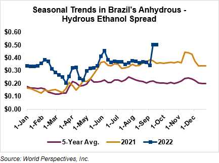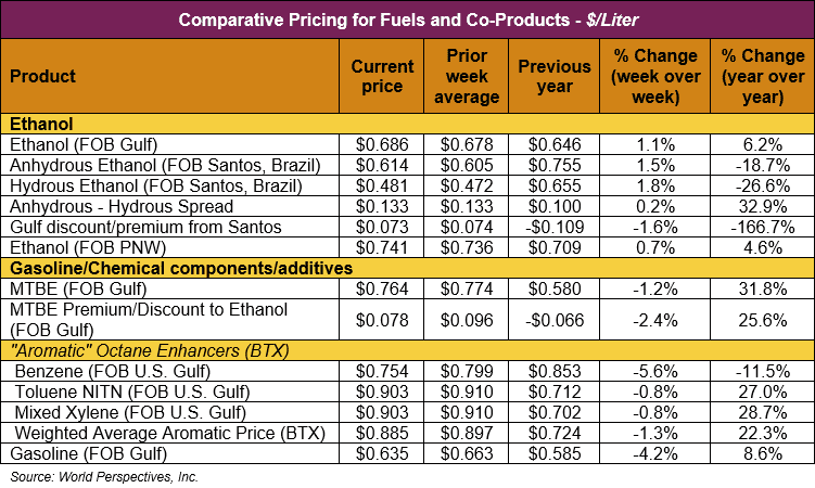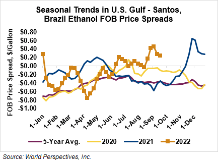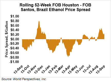 The FOB Gulf-Santos, Brazil ethanol spread has widened from last week’s close through Tuesday’s trading and is currently at 7.25 cents/liter (27.46 cents/gallon).
