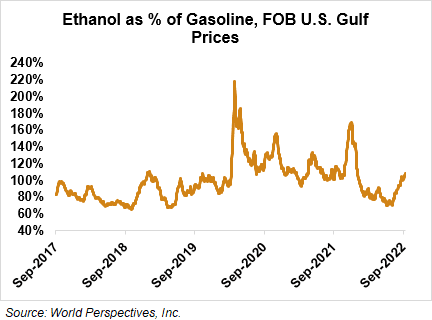 Market Outlook: U.S. ethanol prices ended last week 2 percent lower but strengthened in early week trading to rise 6.1 percent through Tuesday’s close. Midwest wholesale rack ethanol prices were lower to end last week but were up 1.4 percent through Tuesday’s market close to their last quote of 73.07 cents/liter (276.61 cents/gallon).