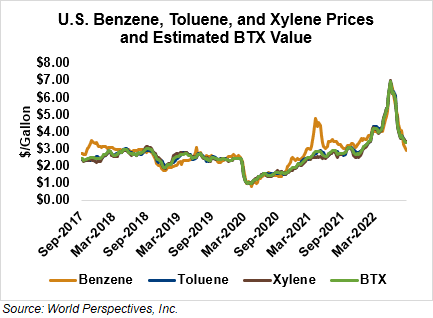 BTX component prices were sharply lower last week and followed that trend through Tuesday’s market close: Benzene was down 4.9 percent while Toluene was down 0.8 percent, and Xylene was down 0.8 percent. The estimated weighted average aromatic price is currently 88.58 cents/liter (335.29 cents/gallon), down from last Friday’s close. The BTX-Houston ethanol spread narrowed last week, and the weighted average BTX price is 19.96 cents/liter (75.54 cents/gallon) higher than the FOB Houston ethanol price.