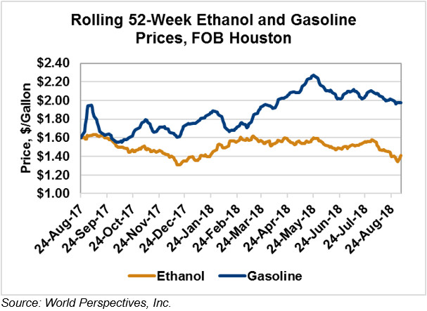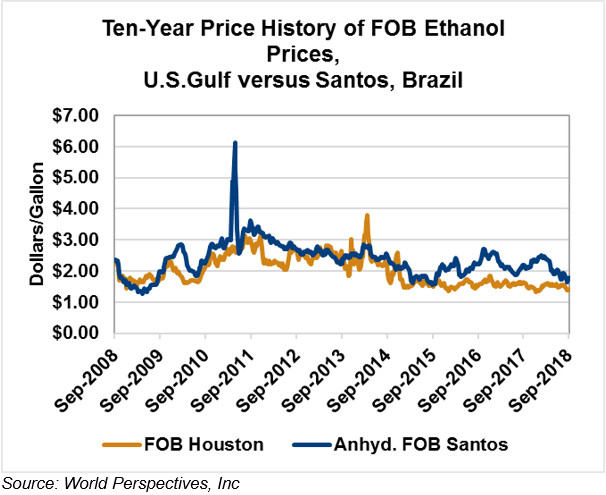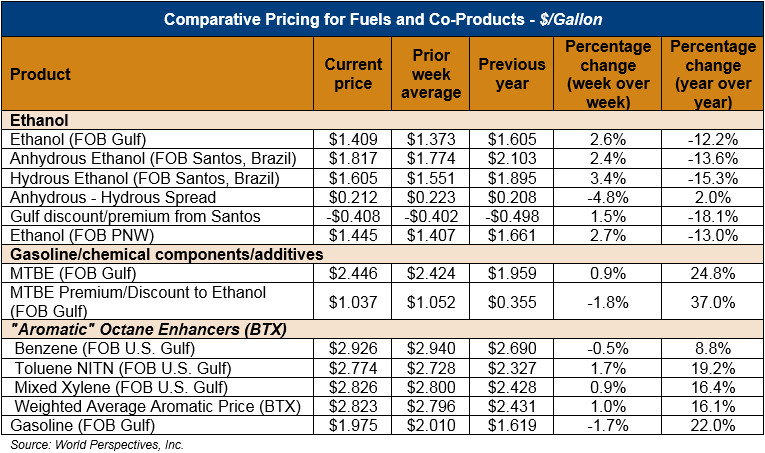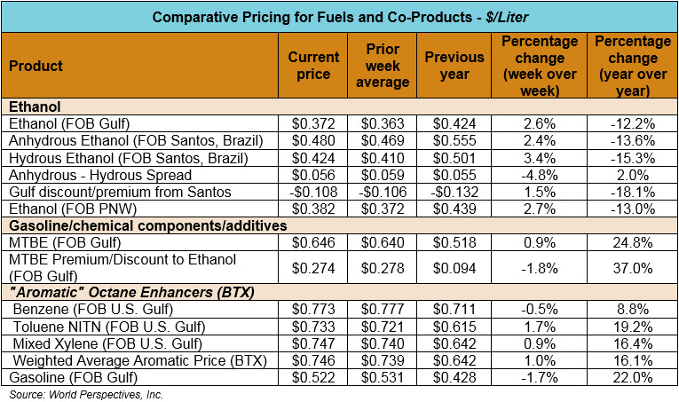 FOB Houston ethanol prices finished last week down over 4 percent but are starting to rebound this week, up 2.6 percent through Tuesday’s trading. FOB Houston prices are quoted at 37.224 cents/liter (140.906 cents/gallon). FOB Santos, Brazil ethanol prices ended last week down, but they are up this week with FOB Santos, Brazil prices at 47.997 cents/liter (181.690 cents/gallon) through Tuesday’s trading.
