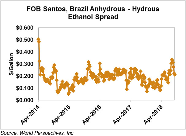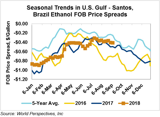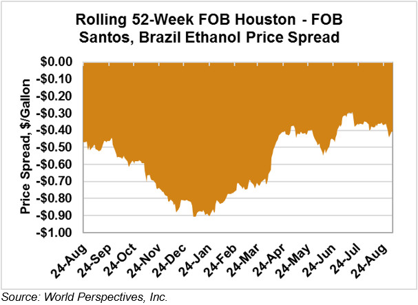 The FOB Gulf-Santos, Brazil spread has widened from last week’s close through Tuesday’s trading and is currently at -10.774 cents/liter (-40.784 cents/gallon).