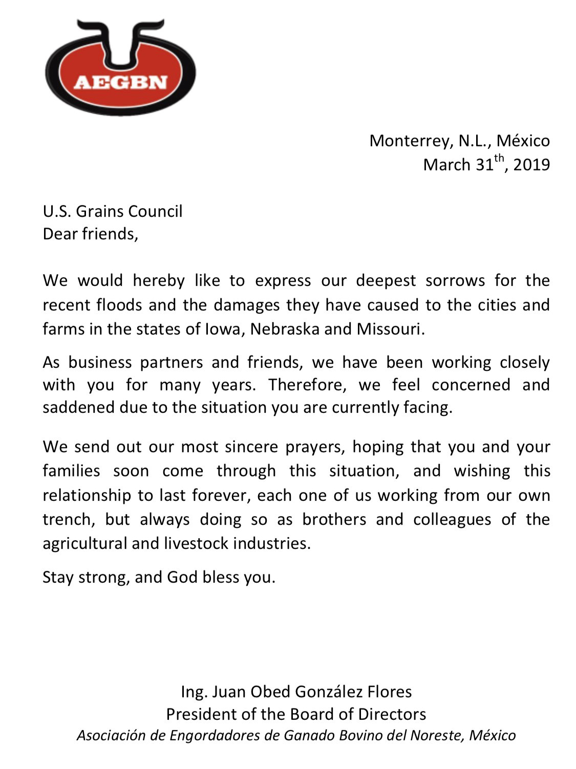 Editor’s Note: The U.S. Grains Council recieved a note from the cattle finishers association of Northeastern Mexico, sharing their support for farmers in the flooding zones. Read the full letter here, which reinforces the strong partnerships built between overseas customers and U.S. farmers.