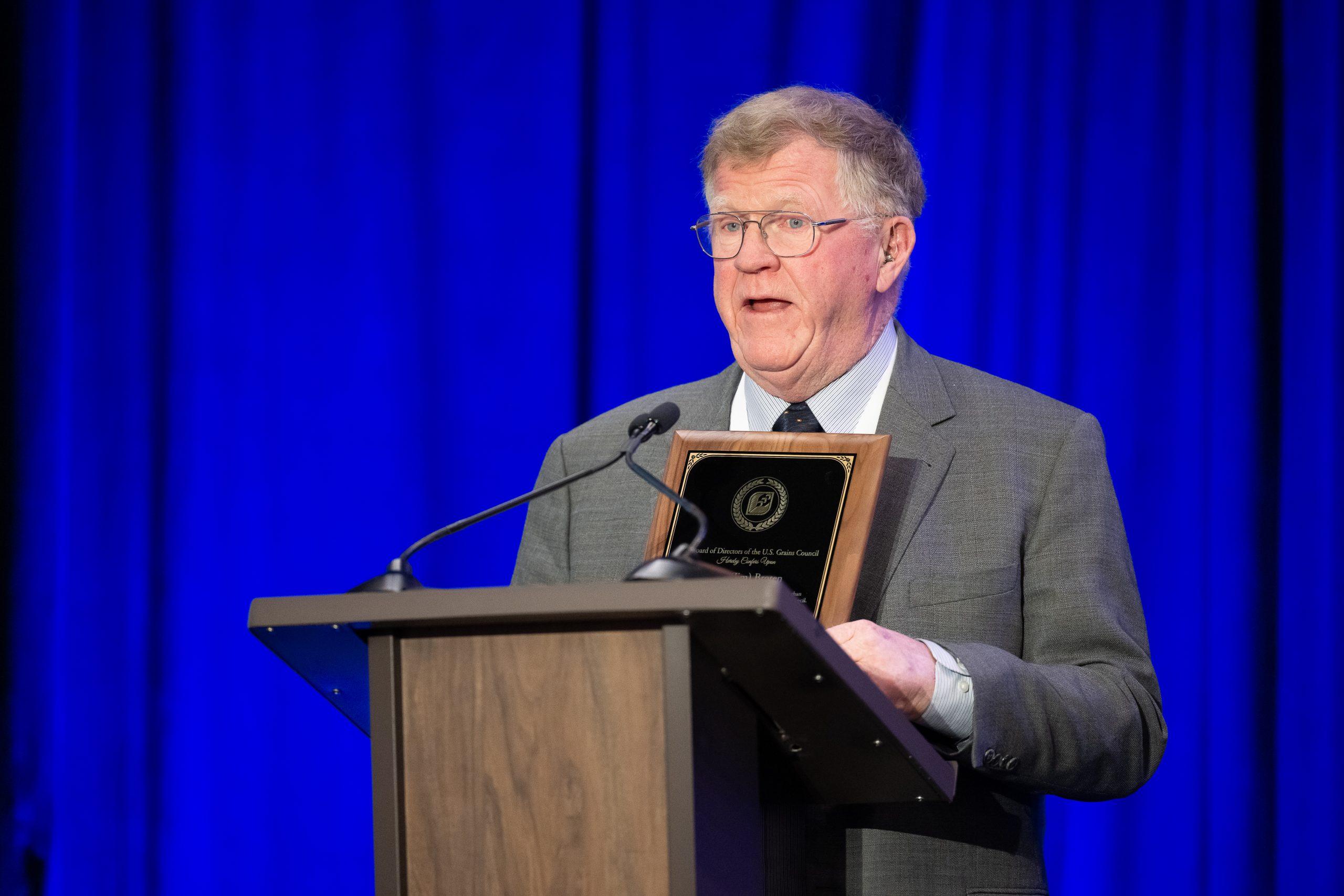 Broten was nominated for the award by nine of his colleagues, including former USGC President and CEO Tom Sleight (right) shown here speaking with Broten at the Council’s 59th Annual Board of Delegates Meeting in 2019. The number of nominators is a testament to the widespread impact of his work with the Council that continues to be felt today.