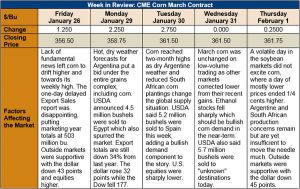 Outlook: March corn gained 5 ¼ cents this week in what, for the current environment, amounts to a sizeable rally. The market found its way higher this week, fueled by dry weather in Argentina, production cuts around the world, and spillover buying from other markets. The fundamentals are hardly bullish yet, but modest production cuts may lift the market from its recent malaise.