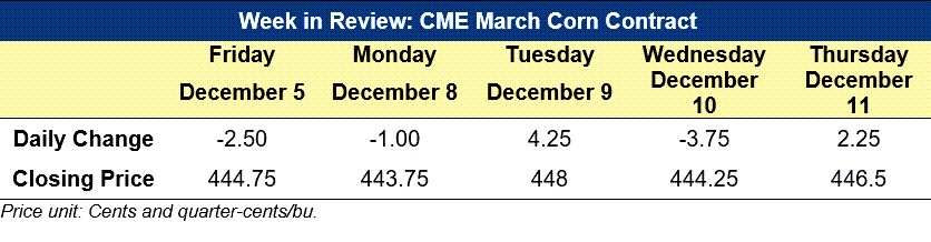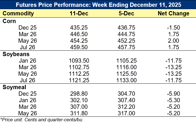 Home | MARKETS, TOOLS & DATA / REPORTS | Market Perspectives Market Perspectives – December 11, 2025 Contents CBOT Corn Futures Prices FOB Prices Distiller’s Dried Grains with Solubles (DDGS) Pricing Ocean Freight Markets and Spreads Download report CBOT Corn Futures Prices Daily Price Evolution: Weekly Price Performance: