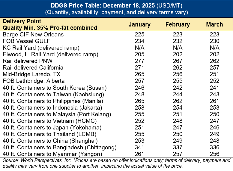 Home | MARKETS, TOOLS & DATA / REPORTS | Market Perspectives Market Perspectives – December 18, 2025 Contents CBOT Corn Futures Prices FOB Prices Distiller’s Dried Grains with Solubles (DDGS) Pricing Ocean Freight Markets and Spreads Download report Distiller’s Dried Grains with Solubles (DDGS) Pricing