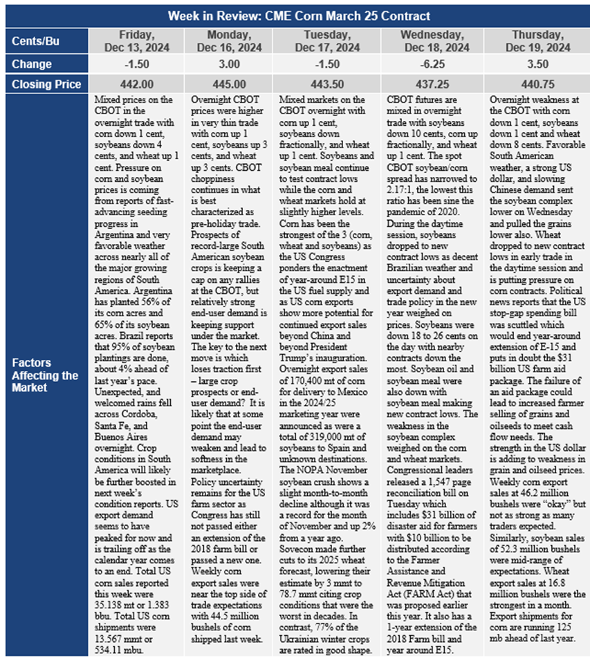 The state statistical Bureau of China released 2024 Chinese crop production data and forecast a record grain harvest of 706 mmt, surpassing last year’s crop of 695.4 mmt. The 2024 Chinese corn crop was estimated at 294 mmt, up 2.1% from last year, and a new record. In 2025, China will allow and encourage the seeding of GM corn & soybeans, and the trade will be watching to see what happens to the size of China’s crops with the implementation of new technology.