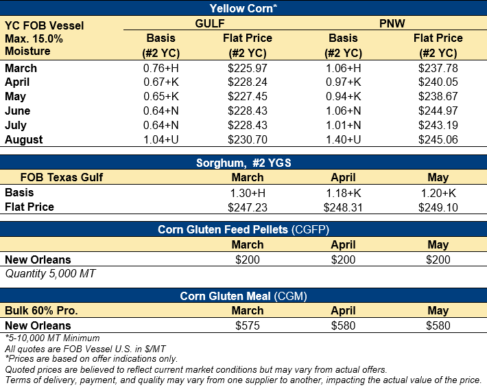 Home | MARKETS, TOOLS & DATA / REPORTS | Market Perspectives Market Perspectives – February 20, 2025 Contents CBOT Corn Futures Prices FOB Prices Distiller’s Dried Grains with Solubles (DDGS) Pricing Ocean Freight Markets and Spreads Download report FOB Prices