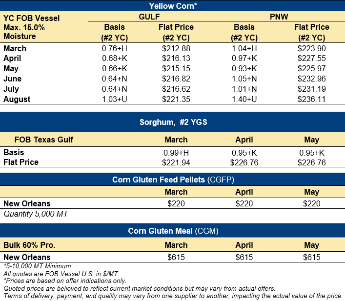 Home | MARKETS, TOOLS & DATA / REPORTS | Market Perspectives Market Perspectives – February 27, 2025 Contents CBOT Corn Futures Prices FOB Prices Distiller’s Dried Grains with Solubles (DDGS) Pricing Ocean Freight Markets and Spreads Download report FOB Prices