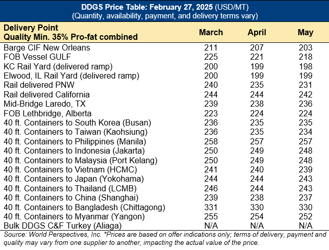 Home | MARKETS, TOOLS & DATA / REPORTS | Market Perspectives Market Perspectives – February 27, 2025 Contents CBOT Corn Futures Prices FOB Prices Distiller’s Dried Grains with Solubles (DDGS) Pricing Ocean Freight Markets and Spreads Download report Distiller’s Dried Grains with Solubles (DDGS) Pricing