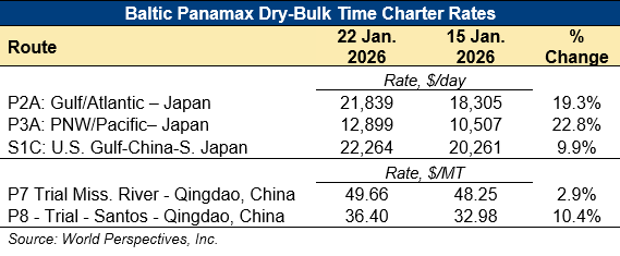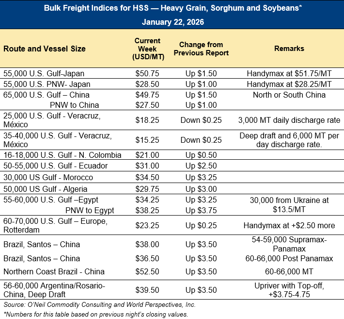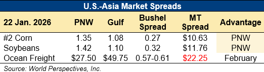 Home | MARKETS, TOOLS & DATA / REPORTS | Market Perspectives Market Perspectives – January 22, 2026 Contents CBOT Corn Futures Prices FOB Prices Distiller’s Dried Grains with Solubles (DDGS) Pricing Ocean Freight Markets and Spreads Download report Ocean Freight Markets and Spreads