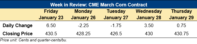 Home | MARKETS, TOOLS & DATA / REPORTS | Market Perspectives Market Perspectives – January 29, 2026 Contents CBOT Corn Futures Prices FOB Prices Distiller’s Dried Grains with Solubles (DDGS) Pricing Ocean Freight Markets and Spreads Download report CBOT Corn Futures Prices Daily Price Evolution: Weekly Price Performance: