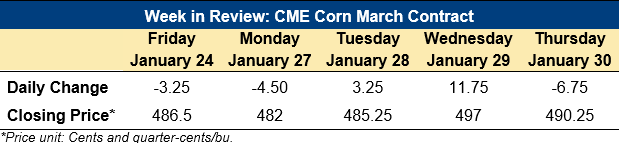 Home | MARKETS, TOOLS & DATA / REPORTS | Market Perspectives Market Perspectives – January 30, 2025 Contents CBOT Corn Futures Prices FOB Prices Distiller’s Dried Grains with Solubles (DDGS) Pricing Ocean Freight Markets and Spreads Download report CBOT Corn Futures Prices Daily Price Evolution: Weekly Price Performance: