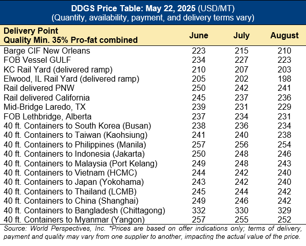 Home | MARKETS, TOOLS & DATA / REPORTS | Market Perspectives Market Perspectives – May 22, 2025 Contents CBOT Corn Futures Prices FOB Prices Distiller’s Dried Grains with Solubles (DDGS) Pricing Ocean Freight Markets and Spreads Download report Distiller’s Dried Grains with Solubles (DDGS) Pricing