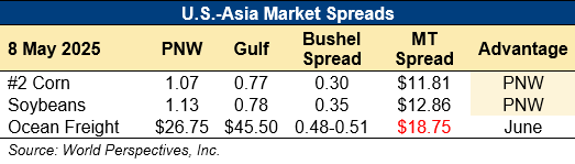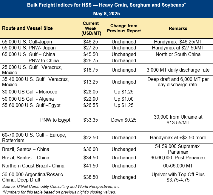 Home | MARKETS, TOOLS & DATA / REPORTS | Market Perspectives Market Perspectives – May 8, 2025 Contents CBOT Corn Futures Prices FOB Prices Distiller’s Dried Grains with Solubles (DDGS) Pricing Ocean Freight Markets and Spreads Download report Ocean Freight Markets and Spreads