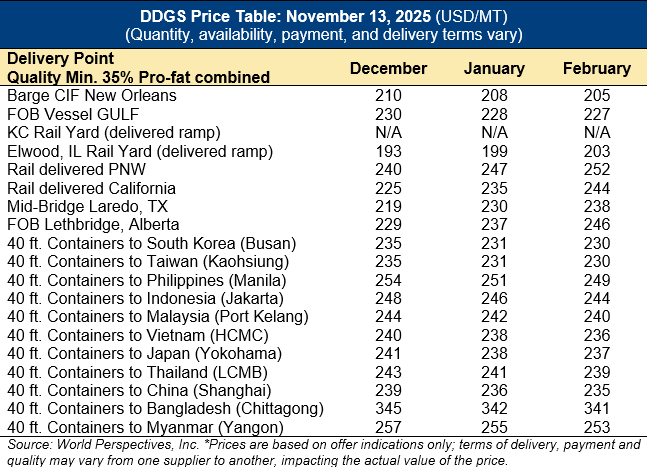 Home | MARKETS, TOOLS & DATA / REPORTS | Market Perspectives Market Perspectives – November 13, 2025 Contents CBOT Corn Futures Prices FOB Prices Distiller’s Dried Grains with Solubles (DDGS) Pricing Ocean Freight Markets and Spreads Download report Distiller’s Dried Grains with Solubles (DDGS) Pricing