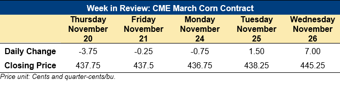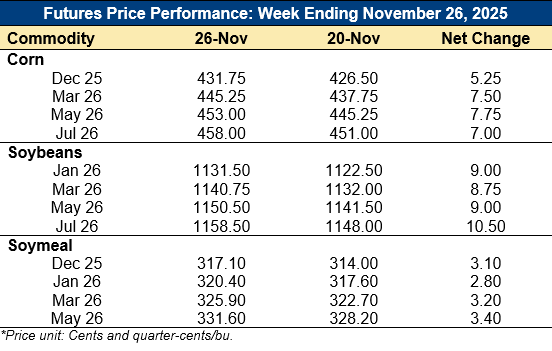 Home | MARKETS, TOOLS & DATA / REPORTS | Market Perspectives Market Perspectives – November 26, 2025 Contents CBOT Corn Futures Prices FOB Prices Distiller’s Dried Grains with Solubles (DDGS) Pricing Ocean Freight Markets and Spreads Download report CBOT Corn Futures Prices Daily Price Evolution: Weekly Price Performance: