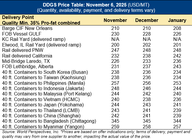 Home | MARKETS, TOOLS & DATA / REPORTS | Market Perspectives Market Perspectives – November 6, 2025 Contents CBOT Corn Futures Prices FOB Prices Distiller’s Dried Grains with Solubles (DDGS) Pricing Ocean Freight Markets and Spreads Download report Distiller’s Dried Grains with Solubles (DDGS) Pricing