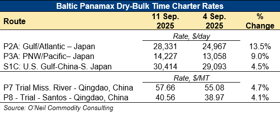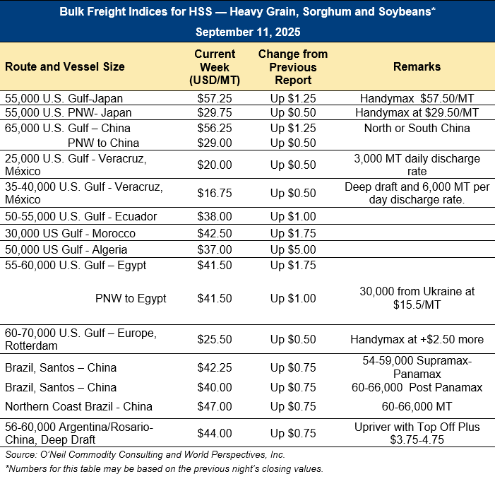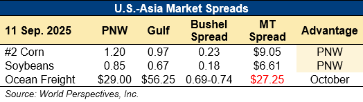 Home | MARKETS, TOOLS & DATA / REPORTS | Market Perspectives Market Perspectives – September 11, 2025 Contents CBOT Corn Futures Prices FOB Prices Distiller’s Dried Grains with Solubles (DDGS) Pricing Ocean Freight Markets and Spreads Download report Ocean Freight Markets and Spreads