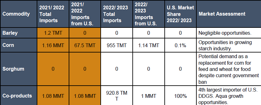 -Increased wet mill capacities and new ethanol plants are estimated to increase MY 2022/2023 corn imports to 1.2 MMT as compared to 1.165 MMT in the previous year