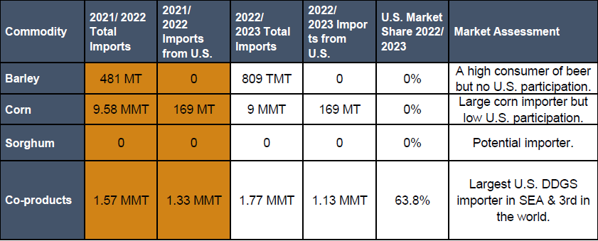-Largest corn importer in Southeast Asia, importing 9.5 MMT in 2022/23 and11.2 MMT in MY 2023/2024.