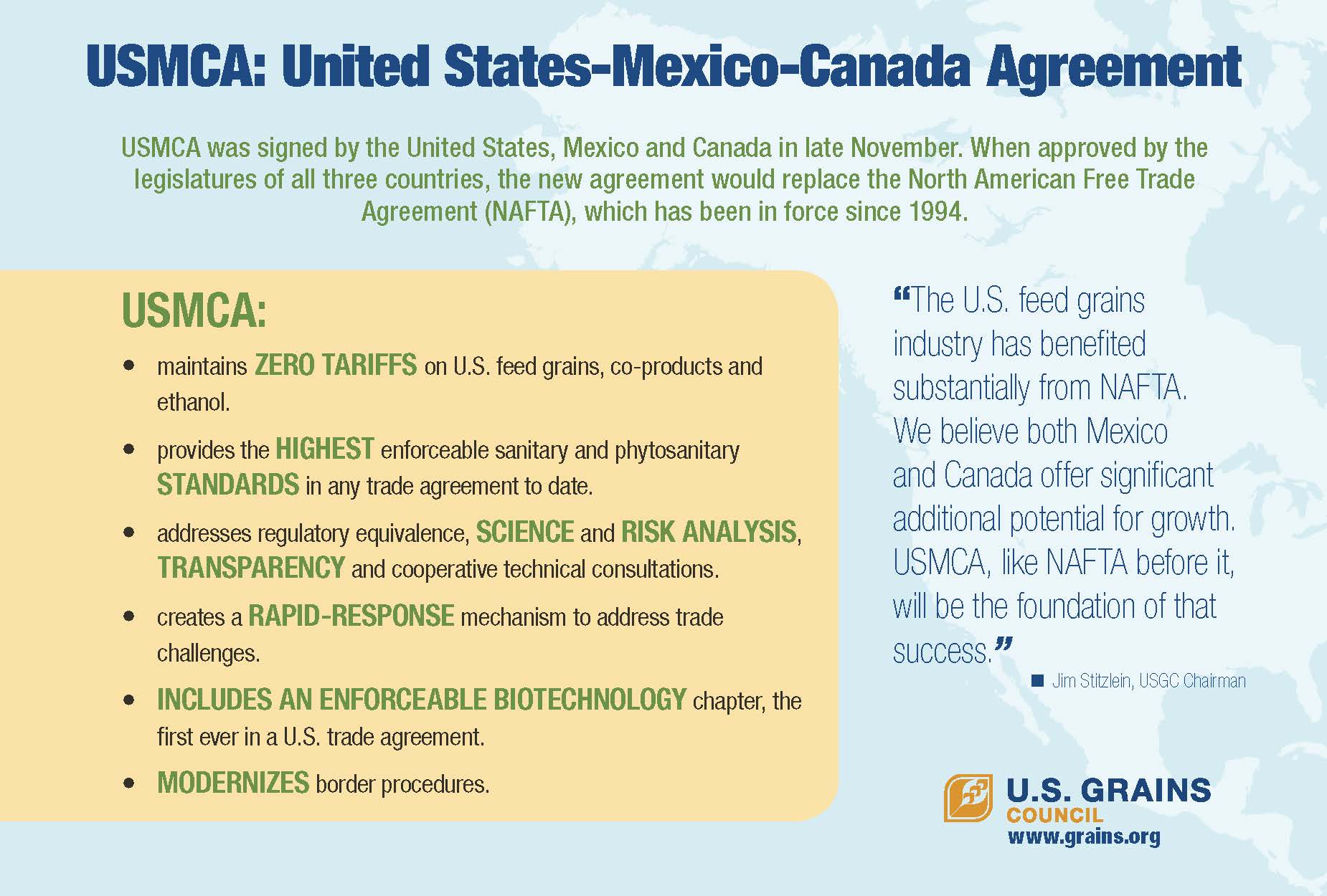 Beyond maintaining duty-free access to the Mexican and Canadian markets, the USMCA also provides the highest enforceable sanitary and phytosanitary standards in any agreement to date, includes an enforceable biotechnology chapter – the first ever in a U.S. trade agreement – and creates a rapid-response mechanism to address trade challenges. Furthermore, the agreement addresses regulatory equivalence, science and risk analysis, transparency and cooperative technical consultations.