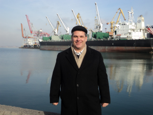 Sifferath visiting a port facility in Odessa, Ukraine, in 2013 to study the area’s grain export infrastructure.