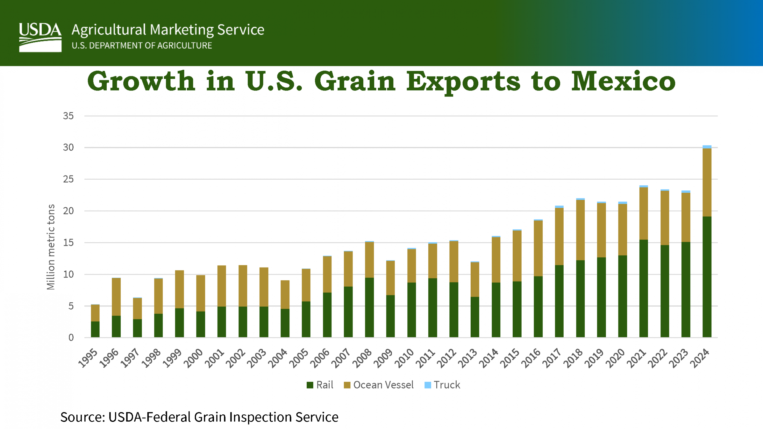 Since the implementation of the North American Free Trade Agreement (NAFTA) in 1994, rail has proven its resilience, handling increasingly larger grain volumes—rising from 8 million metric tons (MMT) in marketing year (MY) 2014/15 to over 23 MMT in MY 2023/24. Rail has fueled Mexico’s feed and livestock industries, enabling it to become the world’s sixth largest feed producer.