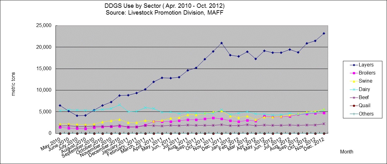 As a result, the sales of DDGS from the United States increased from 8,622,366,000 yen ($107,780,000) in calendar year 2011 to 12,724,573,000 yen ($141,384,130) in CA 2012, up 4,243,591,000 yen.