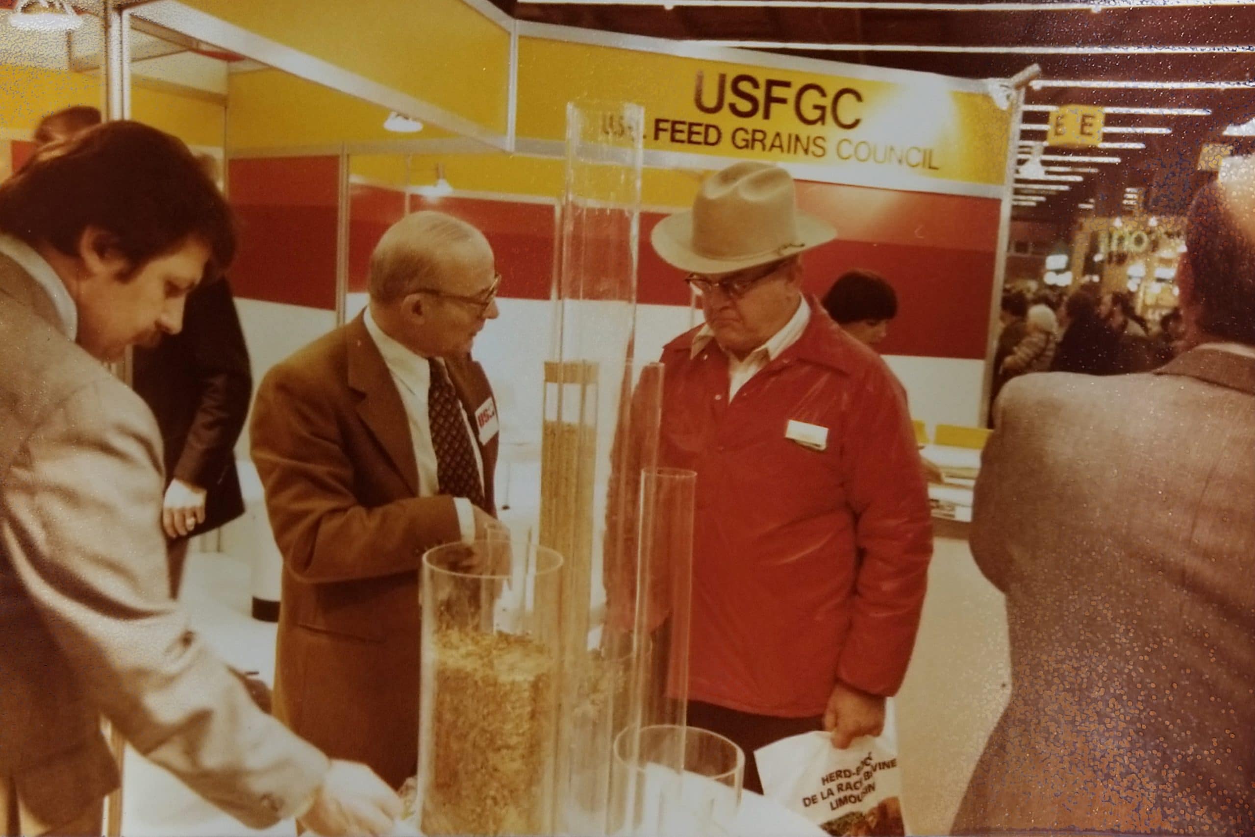 In 1979, the U.S. Feed Grains Council, now the U.S. Grains Council (USGC), operated a trade show booth at the annual International Agriculture Show in Paris, France. The event, which is one of the world's largest agricultural shows, opened its doors in 1963 for agricultural organizations from around the globe to showcase the rich diversity of the industry. In this throwback photo, visitors and Council representatives examine commodity samples available in the Council's booth.