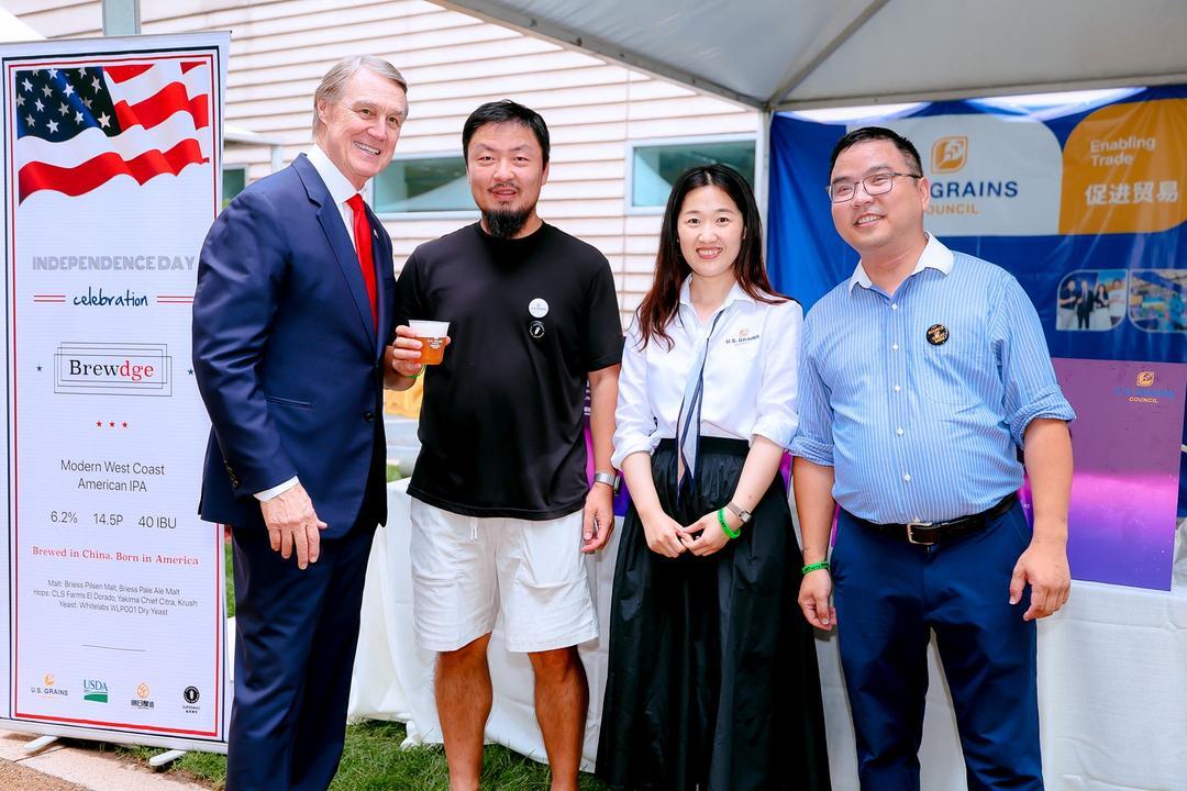 Last week, the U.S. Grains Council (USGC) hosted a booth at the U.S. Embassy in China's Independence Day event in Beijing to share the success of Chinese breweries using U.S. products. Pictured with a sample of a beer brewed in China with U.S. malt are USGC Program Manager Ellie Yan (second from right) and U.S. Ambassador to China David Perdue (left).