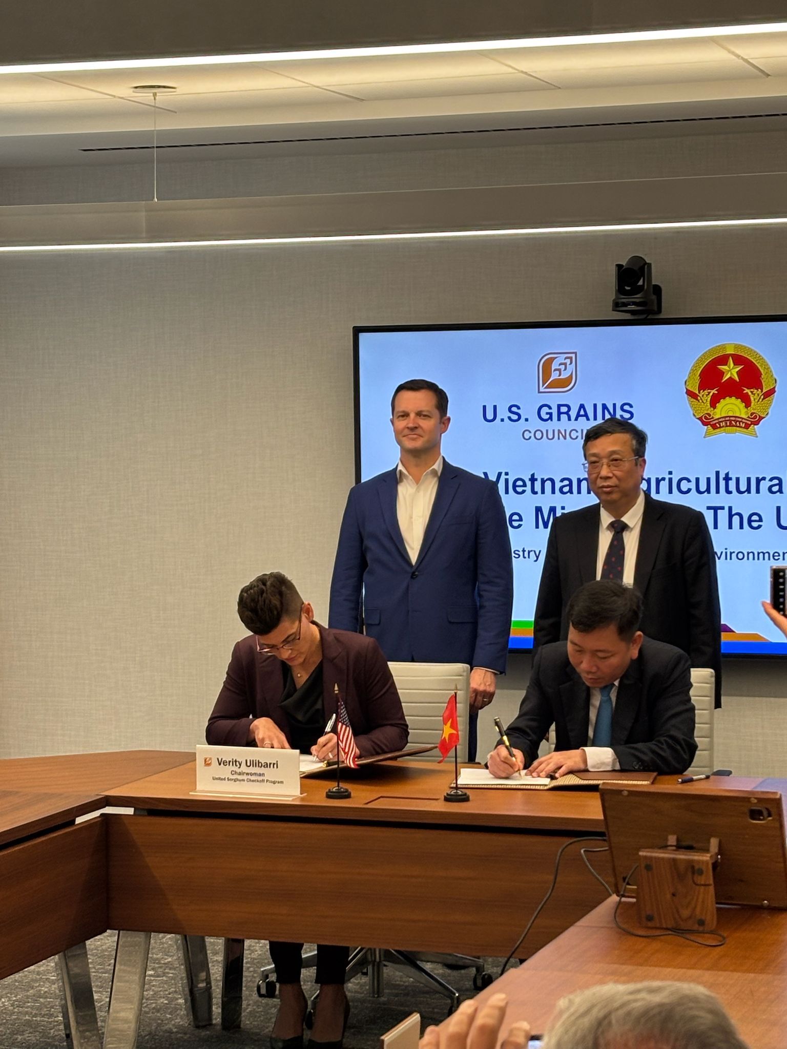 USGC Chairwoman Verity Ulibarri signed the MOU on behalf of the Council with USGC President and CEO Ryan LeGrand observing. The signing took place during a USGC board of directors’ meeting in its Washington, D.C. headquarters, allowing Council leaders to greet the Vietnamese delegation and discuss further U.S. agricultural exports to Vietnam.